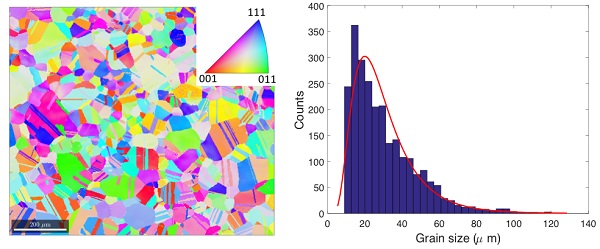 图2 通过SPS烧结的样品原始晶粒结构 (左)电子背散射图 (右) 以及晶粒大小的统计放电等离子烧结条件:纯镍粉1200, 50MPa, 5 min。然后取出之后退火去除残余应力。晶粒大小通过对数正态分布分析得出为30微米。