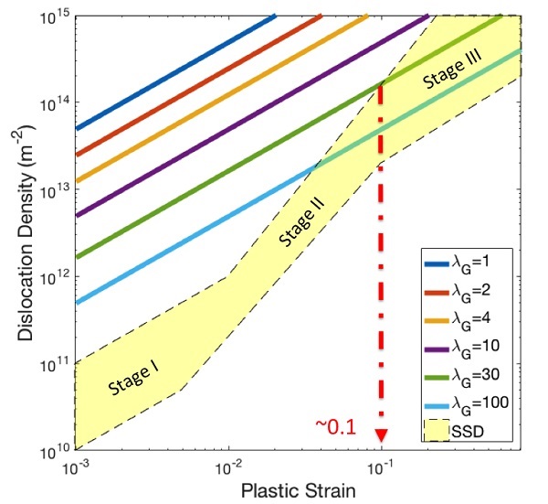 几何需要位错(GND)和统计储存位错(SSD)在材料加工硬化和塑性流动应力都起到了很重要的作用: