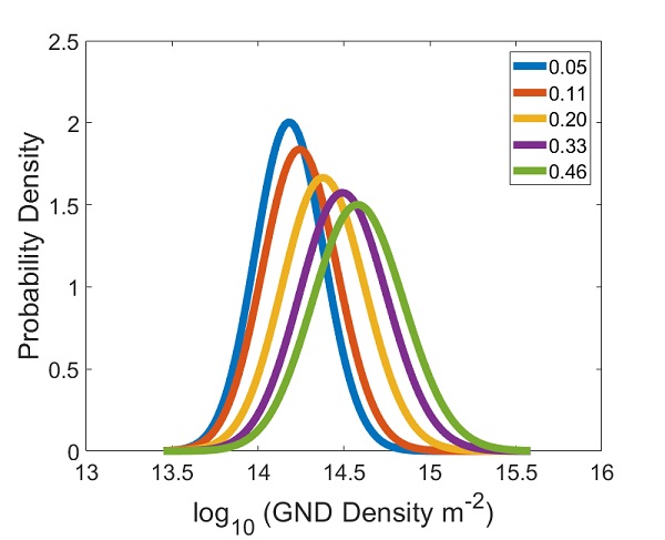 3.几何需要位错(GND)的增长趋势在塑性应变05和0.46之间基本上线性的,这和Ashby的模型相符。由于模型所预测的是晶界附近密度较大的值,所以测量值要小于Ashby 模型所给出的值。测量数据的几何标准差的变化表明随着应变增加,几何标准差变大,也就是形变的不均匀性变高了。