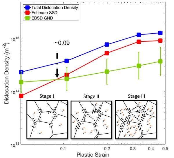 图9 总位错密度 (Taylor,蓝线),测量的GND密度(EBSD,绿线)和估计的SSD密度(前两者差值,红线)关于塑性应变的变化。形变在不同阶段的位错分布示意图。