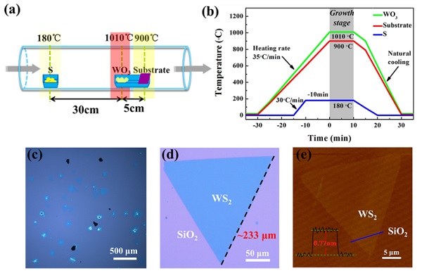 (a)在SiO2/Si基板上大面积合成WS2片的示意图;(b)合成WS2片的温度曲线;(c)(d)在SiO2/Si基板上生长出的WS2片的低/高倍率光学显微照片;(e)生长出的WS2片的AFM表征图,厚度为0.77nm。