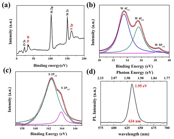 (a)WS2样品的XPS全谱图;(b)WS2样品中W元素的XPS精细光谱图;(c)WS2样品中S元素的XPS精细光谱图;(d)WS2样品的PL光谱图。