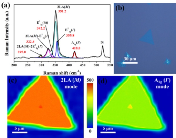 (a)WS2样品的拉曼光谱图;(b)三角形WS2样品的光学显微镜照片;(c)(d)三角形WS2样品的2LA和A1g振动峰的拉曼mapping照片。