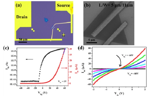 (a)WS2-FET的低倍光学显微镜照片;(b)WS2-FET的高倍扫描电子显微镜照片;(c)WS2-FET的转移特性曲线;(d)WS2-FET的输出特性曲。