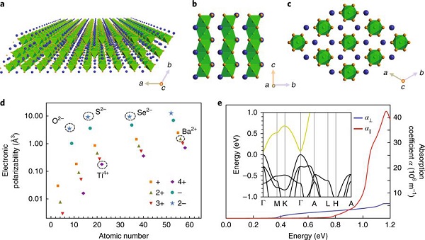 图 1: BaTiS3晶体的透视图,图abc是三种不同视角。蓝色和橙色小球分别是钡和硫,绿球代表钛原子。d,相对于原子序数绘制的针对准1D结构的所选候选离子的电子极化率。e,对于c轴平行(红色)和垂直(蓝色)偏振光的计算吸收系数光谱。 插图显示了计算出的BaTiS3电子能带结构,钛dz2带以黄金突出显示。 Γ,M,K,A,L和H代表布里渊区的临界k点。