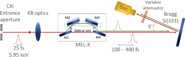 来自LCLS的25 fs FWHM脉冲被MEL-X分分成泵浦和探测光束,MEL-X安装在聚焦光学器件下游约4 m处和样品平面上游约4 m处。在像素阵列检测器上,Si(333)布拉格反射通过近后散射几何进行测量。M2和M3 MEL-X反射镜相对于光轴的插入深度误差如图所示,代表了泵浦探头延迟不确定度最重要的来源。