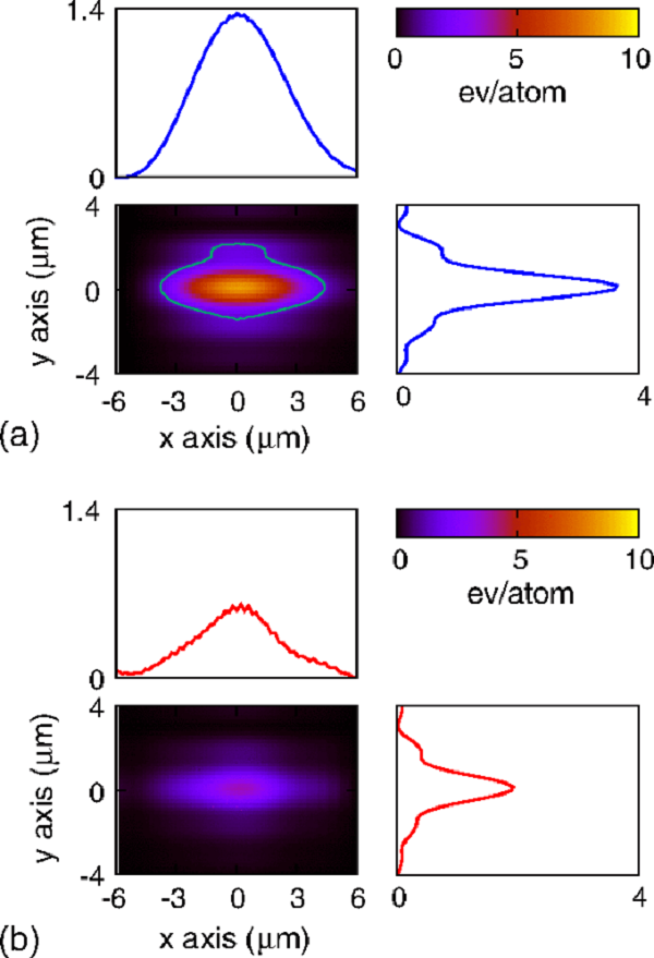 (a)中红线表示1.5 eV/atom的轮廓,泵浦强度的65%包含在该轮廓内。