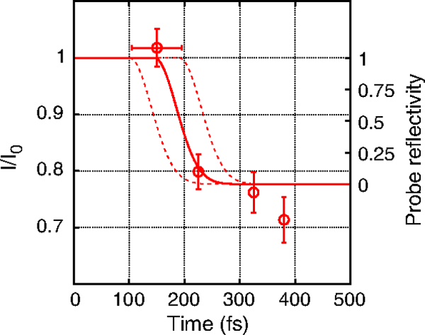该工作研究了5.95 keV的X射线脉冲泵浦下单晶硅的非热熔化。研究数据表明,对于用硬x射线泵浦的硅,电子在等于或高于1.5 eV/atom的阈值温度热化时至少需要110 fs。他们认为,快速热化光电子所需的几百次碰撞导致了这个相当长的时间尺度。一旦开始过渡,离子会从它们的平衡位置发生惯性移位,在315±40 fs内就不存在长程有序,同时,探针反射率的缺失证明了这一点。