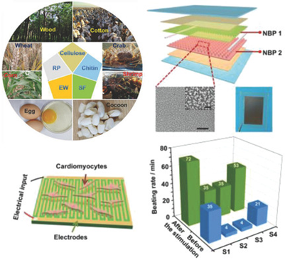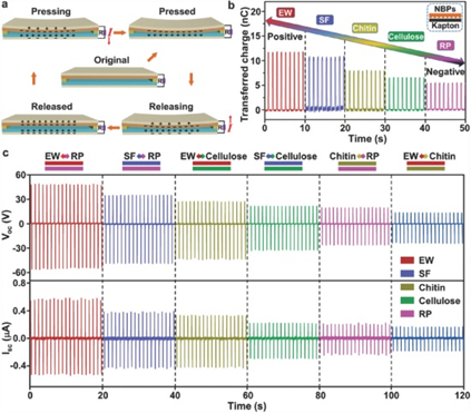 近年来,摩擦纳米发电机(TENG)已被证明能够高效地将环境机械能转化为电能,其原理是基于摩擦起电效应和静电感应之间的耦合。这种新兴的技术为自驱动电子设备提供了一种解决方案。先前的研究表明,TENG能有效地将生物机械能转化为电能,并应用于心脏起搏器、健康监测及细胞和组织工程等领域中。2016年,基于人工合成聚合物材料的全可生物降解的TENG首次被报道。但是,这些聚合物材料通常价格昂贵且含有潜在的有害化学物质。与这些人工合成聚合物相比,天然材料聚合物因其低成本,来源广,可持续和生物相容性良好等特点而受到越来越多的关注。这使得它们在生物医学领域被广泛应用,如药物输送,可吸收缝线和血管支架等。这些天然生物可吸收聚合物(NBPs)主要包括纤维素,甲壳素,丝素蛋白(SF),米纸(RP),蛋清(EW)等。它们具有优异的生物降解性、易加工性和良好的成膜性,这使其非常适合作为TENG的组成材料并应用于生物体内。