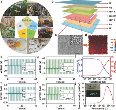 图一:a)来源于大自然的NBPs具有原料来源广泛、低廉和可持续性等优点。 b)典型BN-TENG器件的结构示意图。 c,d)NBP薄膜表面纳米结构的扫描电子显微镜(SEM)和原子力显微镜(AFM)图像。SEM图下部和上部比例尺:5和1微米。 e-h)使用正向连接(e,f)和反向连接(g,h)测试BN-TENG得到的输出电压和电流性能图。 i)BN-TENG在不同外部负载电阻条件下的输出电压和电流曲线。 j)BN-TENG在不同外部负载电阻条件下的输出功率密度曲线。插图显示BN-TENG点亮前后10个商业LED的照片。