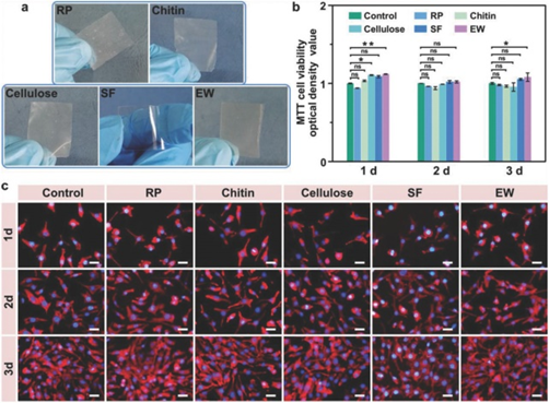 图二 a)RP,甲壳素,纤维素,SF和EW的光学照片。b)L929细胞在NBP膜上分别培养1、2和3天后的MTT测试结果。所有数据均以平均值±SD表示。 P值是通过t检验来计算的。 * P <0.05,** P <0.01,NS =无显著性差异。 c)L929细胞在NBP膜上分别培养1、2和3天后的免疫荧光染色图。比例尺:50微米。