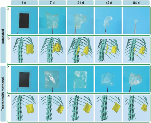 图四: a)c)在37℃下浸泡在PBS溶液中,分别用U-SF膜(a)和M-SF膜(c)封装的BN-TENG随时间降解变化图。 b,d)分别用U-SF膜(b)和M-SF膜(d)封装的BN-TENG植入到SD大鼠体内后随时间降解变化图。(b)和(d)中的所有图像均由Micro-CT系统重建并用伪彩技术进行处理。