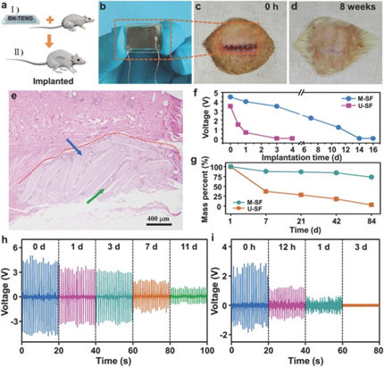 图五: a)BN-TENG植入SD大鼠体内的示意图。 b)用M-SF膜封装的BN-TENG的实物图。 c)BN-TENG植入SD大鼠皮下,缝合后植入部位的初始状态。 d)8周后植入部位恢复情况。 e)SD大鼠体内BN-TENG植入部位组织的H&E染色组织切片图。红色虚线表示BN-TENG残留物与皮下组织之间的边界。蓝色箭头表示BN-TENG的降解残基。绿色箭头表示BN-TENG残基周围的再生正常组织。 f)分别用U-SF和M-SF膜封装的BN-TENG在SD大鼠体内的输出电压随时间变化对比。 g)分别用U-SF和M-SF膜封装的BN-TENG在37℃、PBS溶液浸泡条件下质量损失比随时间变化对比。 h,i)分别用U-SF和M-SF膜封装的BN-TENG在SD大鼠体内的电输出电性能随时间变化。