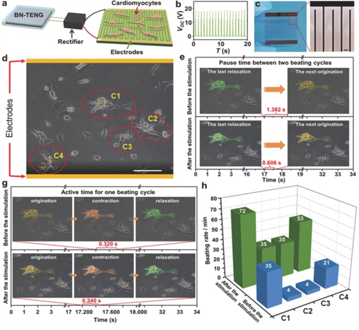 组织工程中的电刺激为细胞调节和组织修复提供了一种有希望的途径。以前的研究结果证实了它在临床和研究环境中的可行性和有效性。本文中,BN-TENG的电输出具有较高的电压和较低的电流,有利于其在生物医学领域中电刺激的应用。为了证明可以用BN-TENG来调节心肌细胞簇的跳动,我们将BN-TENG和叉指电极整合到一个自供电刺激系统中。如图6a所示,整个刺激系统是由BN-TENG、整流器和叉指式电极所组成。叉指电极采用50μm厚的聚二甲基硅氧烷(PDMS)薄膜封装,以避免电极与培养基之间的电化学反应(图6c)。由BN-TENG产生的18V整流输出电压连接到叉指电极上以形成直流电场(图6a,b)。考虑到PDMS封装层的厚度,心肌细胞和器件之间的界面处的实际电场强度约为8 V cm-1。