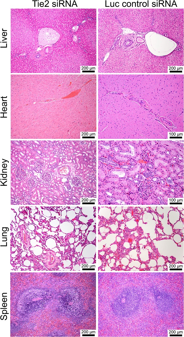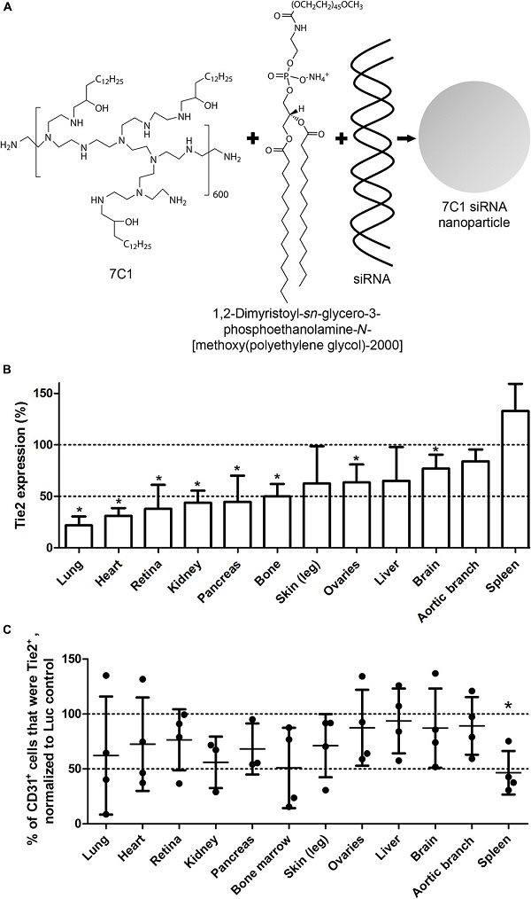 在非人类灵长类动物的早期的转化研究表明,由可电离的低分子量聚合物7C1和siRNAs制成的纳米颗粒可以诱导多器官内皮中的RNAi。最大数量的基因敲除在肺和心脏被观察到,这与以前的啮齿动物研究很一致。此外,在视网膜、肾脏、胰腺和骨骼的脉管系统中发现了有效的基因敲除,有可能为这些器官和组织创造新的以血管为中心的、基于RNA的治疗方法。此外,在1 mg/kg的剂量下,在肝脏内皮细胞中没有观察到有统计学意义的敲除,有助于避免肝相关的靶外效应。此外,在这些研究过程中没有发现急性毒性的迹象,且此次研究提供了新的证据,证明使用全身用药的siRNA纳米颗粒,在大型非人灵长类动物中,有内皮基因沉默现象。