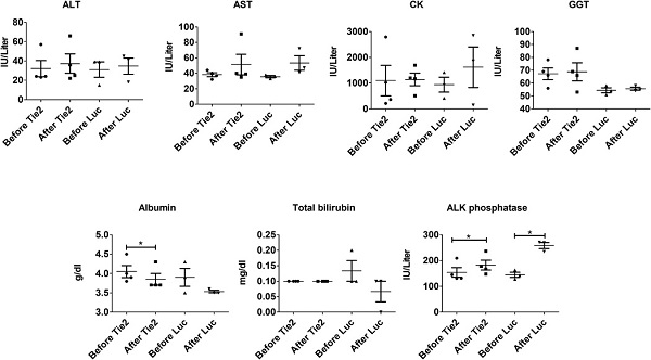 图二、7C1 siRNA治疗前后的非人类灵长类动物血液化学和肝功能数据