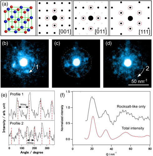 目前对非晶Ge-Sb-Te相变材料的局部原子结构仍未观测清楚,而导致也没有很好地理解不同光学对比度的快速结晶非晶相变。近期,日本东北大学A. Hirata等研究人员报告了在非晶态Ge2Sb2Te5中使用“局部”反向蒙特卡罗模型直接观察到了原子结构,该模型致力于埃-束流电子衍射分析。结果证明,与对称晶体相比,具有岩盐晶体结构的局部结构存在较大的畸变。这种畸变导致理想八面体原子环境的破坏,从而形成局部无序结构,基本满足整体非晶态结构因子的要求。提出晶体状畸变八面体结构可能是Ge-Sb-Te整体非晶态结构形成的主要基础。