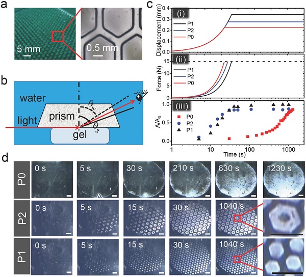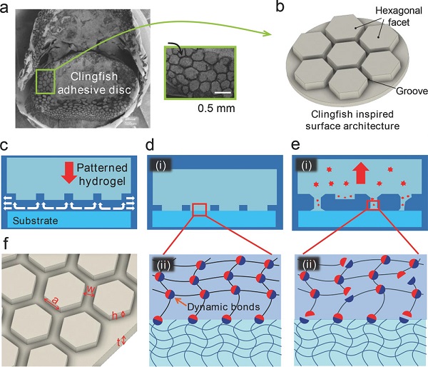 (c).六边形凹槽作为排水通道帮助水凝胶在水下与表面快速接触