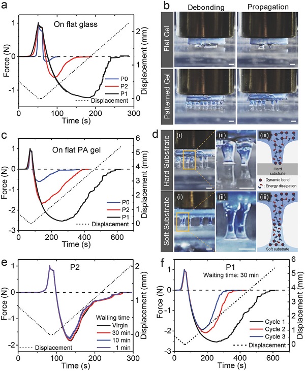 在这个工作中,作者报导了一种制备在水下具有快速、可逆和粘性的强性水凝胶的方法。这种方法通过将动态键和生物启示的表面排水结构相结合制备得到水凝胶。制备得到的水凝胶只需在短时间内通过很小的应力作用就可以粘附在表面。其粘附强度和剥离能可达25kPa和50J/m2.