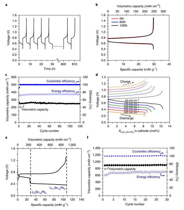 近日,中国清华大学的伍晖和美国斯坦福大学的崔屹(共同通讯作者)等人,报道了一种熔融锂负极,熔融Sn-Pb或Bi-Pb合金正极和石榴石型Li6.4La3Zr1.4Ta0.6O12(LLZTO)固体电解质,组成的固体电解质基熔融锂电池。在240℃、50和100 mA cm-2电流密度下,Li||LLZTO||Sn-Pb和Li||LLZTO||Bi-Pb电池可以稳定循环约一个月,几乎没有容量衰减,平均库仑效率为99.98%。同时,电池具有高功率能力,Li||LLZTO||Sn-Pb电池在电流密度高达300 mA cm-2时,功率密度为90 mW cm-2,Li||LLZTO||Sn-Pb电池在电流密度高达500 mA cm-2时,功率密度为175 mW cm-2。这种中温电池有望成为高安全性、低建造和维护成本的电网储能电池。相关成果以“An intermediate temperature garnet-type solid electrolyte-based molten lithium battery for grid energy storage”为题发表在Nature Energy上。