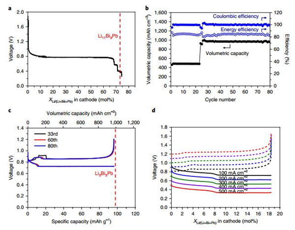 (b)在100 mA cm-2充电后和放电过程中,Li||LLZTO||Bi-Pb电池冷却5小时(降至30°C),然后再次回到240°C的电压曲线图。