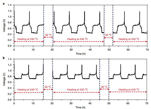 (a)在50 mA cm-2充电和放电过程中,Li||LLZTO||Sn-Pb电池冷却5小时(降至30℃),然后再次加热回到240℃的电压曲线图;