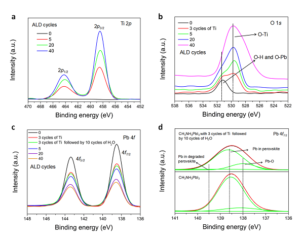 钙钛矿上沉积不同循环数TiO2样品的电子能谱分析:a)Ti2p, b) O1s, c) Pb4f, d)Pb4f7/2。