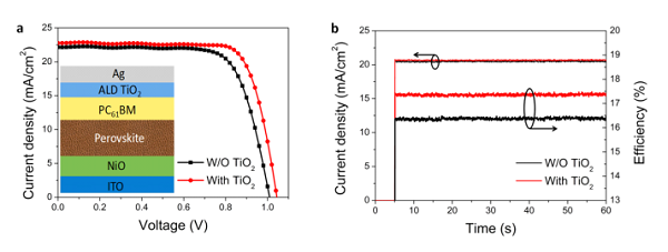该团队优化了原子层沉积工艺,并通过原子层沉积技术在无损钙钛矿的情况下,在钙钛矿上表面成功的引入了TiO2和Al2O3;通过引入了TiO2界面层,将器件效率从16.4%提升至18.3%;通过引入Al2O3封装层,极大的提升了器件稳定性,为钙钛矿的产业化发展奠定了基础。