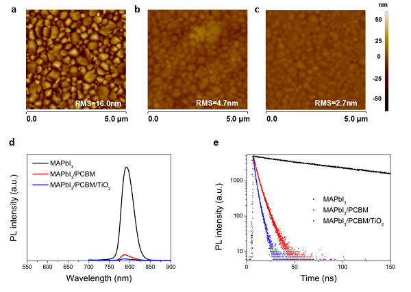 - 钙钛矿 b) 钙钛矿/PC61BM c) 钙钛矿/PC61BM/2 nm ALD TiO2的AFM形貌图;钙钛矿, 钙钛矿/PC61BM, 钙钛矿/PC61BM/2 nm ALD TiO2的a) 荧光, b) 瞬态荧光测试结果。
