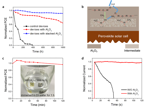 有机无机杂化钙钛矿材料由于优异的光电性能和低廉的制造成本而受到科研工作者的广泛关注,基于钙钛矿材料的太阳能电池在短短几年内,光电转化效率已经突破22%,成为光伏领域的一颗新星。然而,钙钛矿型材料耐水性差,限制了其商业化应用前景。因此,在项本工作中,科学家们通过原子层沉积技术(ALD)制备了金属氧化物层应用于钙钛矿太阳能电池器件中,取得了在极端条件下都相对稳定的钙钛矿太阳能电池器件,为钙钛矿的产业化发展奠定了基础。