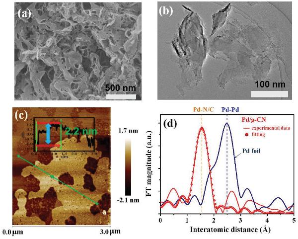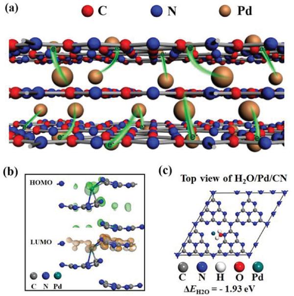 a) 具有层间和表面键合Pd原子的Pd/g-CN复合材料示意图;