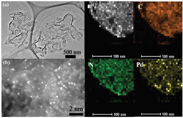 b) Pd/g-CN复合材料的像差校正HAADF-STEM图像;