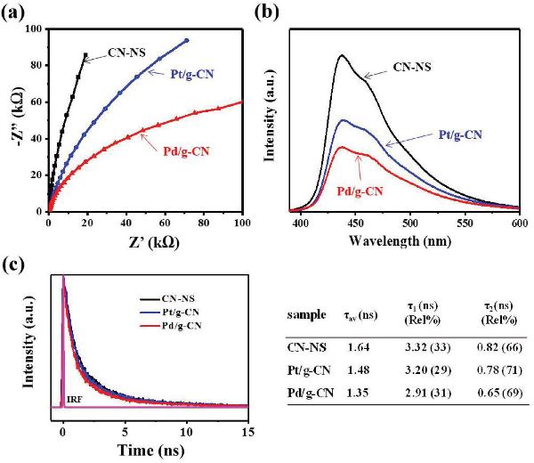 c) CN-NS、Pd/g-CN和Pt/g-CN的TRPL光谱。