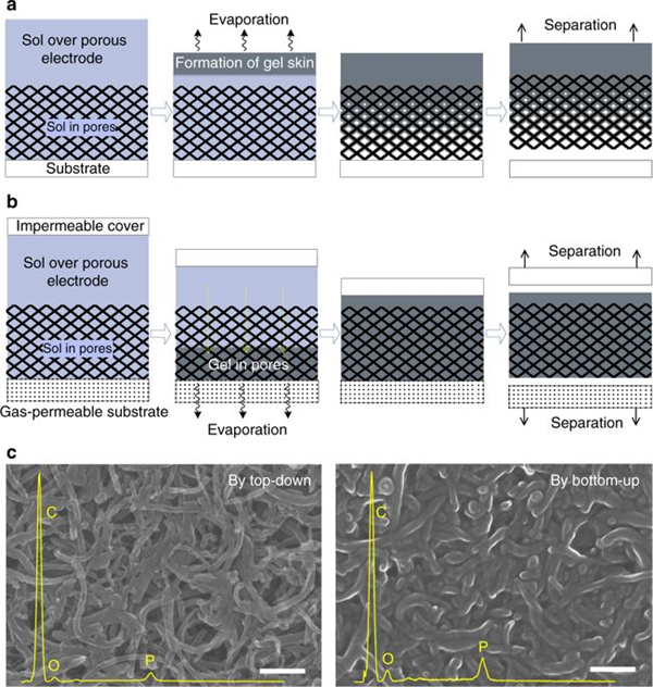 (b)自下而上的填充方法;(从左到右:溶胶浇铸在位于透气基材上的多孔电极上,并覆盖不渗透的薄膜;从底部向上形成凝胶,直到整个多孔电极充满凝胶;除去基材后获得独立的凝胶填充电极)