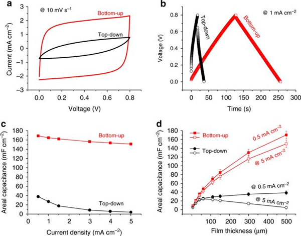 (d)在0.5和5 mA cm-2时,自上而下和自下而上填充FSSC器件的面积电容的厚度依赖性关系图。