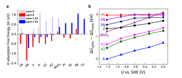 图1给出了几种具有代表性的氮掺杂石墨烯的结构。图2a给出了常电势方法和电中性方法两种计算方法得出的ΔG。从图2a可以看出2D材料的两种方法算出的ΔG值有明显的不同,尤其是在高电压(U)条件下。例如:在U=1.23 V, 对于Z和A 型N掺杂石墨烯材料采用传统的电中性方法计算得到的ΔG分别为0.47 eV 和1.79 eV,这一结果表明H不会吸附在N上。然而,常电势方法计算得到的ΔG分别为-0.25 eV和-0.22 eV,表明H会吸附在N上。电荷对2D材料的电化学反应有如此大的影响,因此在计算时应该采用常电势方法, 而且有必要重新考虑先前基于电中性方法得出的2D材料的催化机制。有趣的是,电荷对所有测试的3D金属材料影响都非常小。