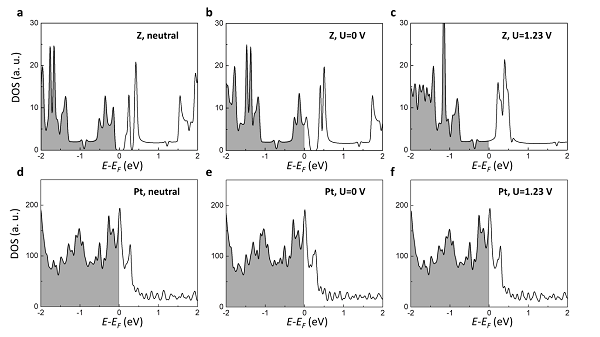 为了进一步理解为什么2D材料的化学反应活性对电荷更加敏感,我们比较了2D材料和3D金属之间的电子态密度(DOS)。图4为 Z型N掺杂石墨烯和Pt的DOS。对于Z型N掺杂石墨烯(图4a),当材料充电到目标U时,DOS的占据显著变化;相反,对于Pt,即使在高U = 1.23 V下,DOS填充仍然几乎相同。这是由于,与3D金属相比,2D材料特别是石墨烯的“量子电容”很小。因此,为了获得与3D金属类似的电荷,2D材料的电子态占据需要显著变化。由于化学反应活性受电子态占据强烈影响,所以2D材料的化学反应活性对电荷更加敏感。
