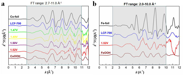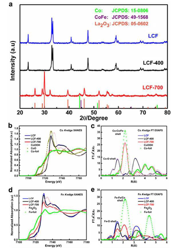 总之,研究团队通过一种简单的钙钛矿出溶金属纳米颗粒的方法制备出高活性的OER催化剂。合成的氧化镧锚式CoFe催化剂(LCF-700)在0.1M KOH中达到10mA cm-2电流密度时表现出293mV的低过电位。研究团队设计的电催化原位样品池,以及发展的operando XAS实验技术解决了气泡对于数据采集影响的问题,在高电压下仍然可以获得高质量的X射线扩展边精细结构(extended X-ray absorption fine structure, EXAFS)数据,提高了结构解析的精度。针对LCF-700开展了operando XAS实验,实验结果清晰表明在电化学条件下,催化剂的结构、电子结构发生了电压依赖的变化。随着电压的升高,Co/Fe价态逐渐升高;EXAFS分析表明CoFe纳米合金随着电压逐渐转变为(Co/Fe)O(OH)。因此,建立了结构重构与OER之间的直接关联,并且确定了在这个体系中(Co/Fe)O(OH)为真实的活性物质。特别是,通过对比实验发现La2O3基底和Fe掺杂可以促进表面的重构,进而增强了催化剂的反应活性。该项工作为简单且易于扩展的有效电催化剂合成OER开辟了一条新途径。此外,这一工作表明operando XAS技术是一种研究电催化剂真实工作状态的强有力手段。