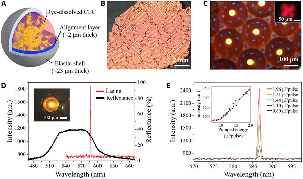 ( A )由染料溶解的CLC芯、内取向层和外弹性壳组成的光子胶囊谐振器的示意图;