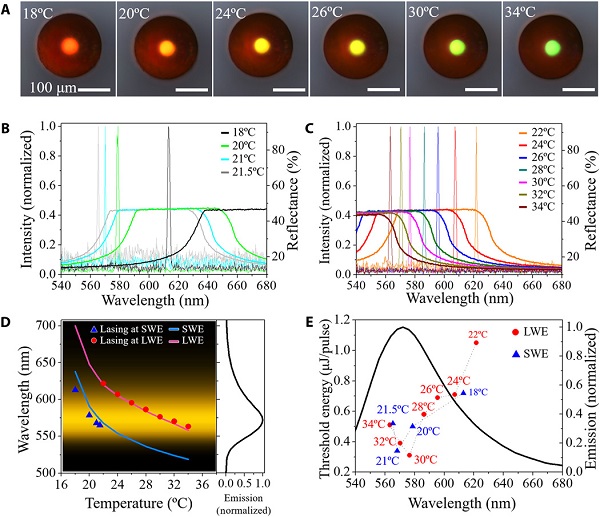 (D) LWE、SWE和激光发射的波长作为温度的函数,其中染料的自发发射光谱显示在右侧面板中,并在主面板中用颜色梯度表示;