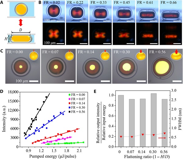 (E)对于每脉冲1.4μJ的泵浦能量,输出强度相对于胶囊平坦区域(左x轴)上的输入能量,其中用球形胶囊(FR = 0)的值归一化;