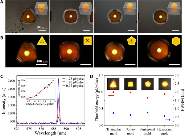 (D)阈值能量(红色圆圈;左y轴)和FWHM的激光光谱(蓝色圆圈;右y轴)用于限制在三角形、正方形、五边形和六边形孔中的胶囊。插图显示从形状改变的胶囊发射激光;