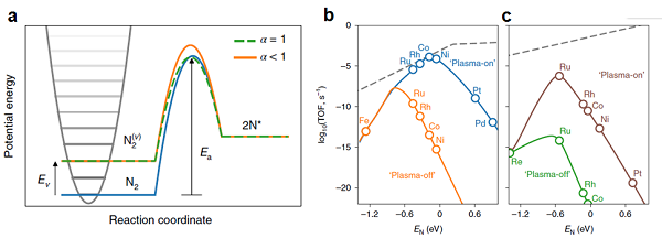 在合成氨反应:N2 + 3H2 = 2NH3。针对该反应最理想的催化剂应该能够稳定N2解离的过渡态,同时减弱对NHx的吸附从而不限制进一步反应,以及促进NH3的脱附。然而,在传统催化剂中活化能和吸附能彼此关联,十分难以独立调控这些能量参数。因此,在一维参数空间中,合成氨催化剂的活性通常限制在火山曲线里,想要进一步提高十分困难。即使是最好的催化剂,要想达到符合实用的反应速率,温度必要达到~700 K,压力要达到~100 atm。要想设计更高效的催化剂就需要突破这种线性关系。外场刺激可以克服上述线性关系。通过外场将N2激发到亚稳振动激发态或电子自发态能够有效削弱N2解离能垒,而不影响接下来的反应路径。通过弱电离源气体产生非热等离子体可以诱导生成振动激发态或电子激发态的分子,伴随产生自由基、离子和自由电子等其他活性物种。由于这些等离子体远未达到热稳态,能够产生活化的物种,而不显著提升整体气体的稳定。