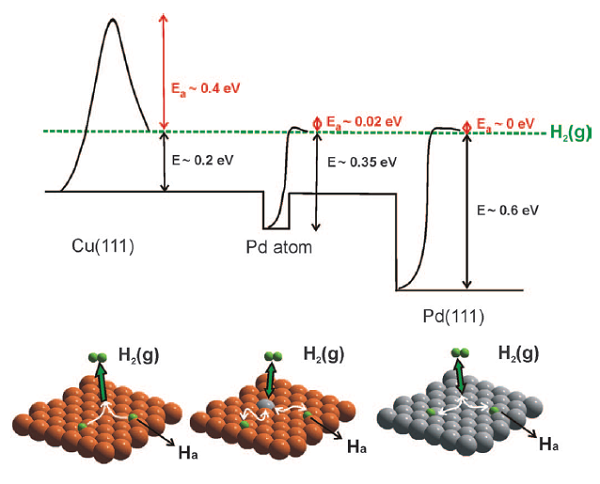 图2. H2在Cu(111)、Pd1/Cu(111)和Pd(111)表面的解离能垒。