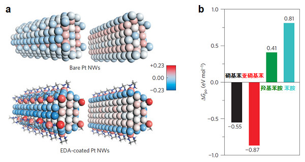 图3. (a)Pt纳米线和EDA修饰的Pt纳米线的Bader电荷。(b) 不同含N芳香化合物在EDA修饰的Pt纳米线上的吸附能。