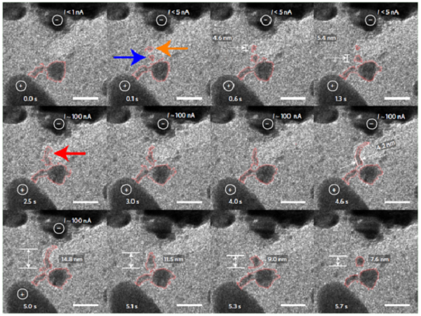 忆阻器是具有滞回性的变阻器件,其电阻值取决于此刻流过器件的电流和以往通过器件的电荷量,具有保持断电瞬间电阻的特性。这一特性与人类大脑的神经突触具有高度相似性,可用于开发具有自主学习能力的智能器件。基于此美国麻萨诸塞大学阿默斯特分校Jianhua Yang研究团队发展出了一种新型扩散型忆阻器。并且通过原位电场TEM研究了此类忆阻器器件实现神经突触仿生模拟的主要机制。
