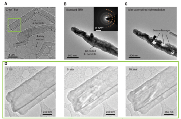 一直以来,锂枝晶和固体-电解质界面是困扰锂电池发展的重要问题,但是,传统的TEM电子束能量很大,极易对电池材料或者界面造成损坏,改变电池材料的形貌和化学组成。借鉴冷冻电镜(cryo-electron microscopy, Cryo-EM)生物样品的制备方法,使用冷冻电镜技术可保留电池材料的原始状态,实现在原子尺度上对电池材料真实的研究。