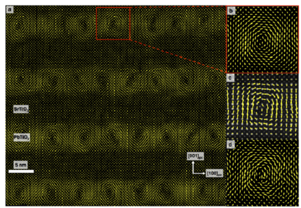 铁电材料的拓扑畴结构被认为在超高密度数据存储方面的应用前景十分广阔。理论上早有研究预言过铁电材料中的拓扑畴结构,然而实验方面的进展却一直很缓慢。铁电材料的极化是通过离子位移实现的,因此超高分辨的TEM成为了表征铁电材料微小纳米畴结构最有效的手段。