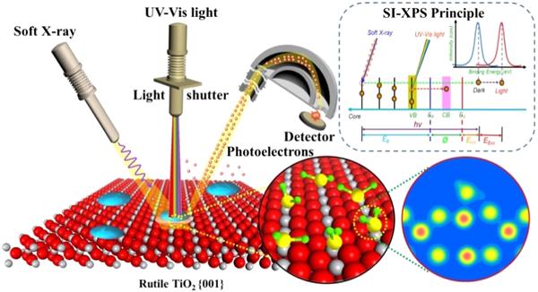 用于观察R-TiO2(001)上分解水的SI-XPS技术的示意图及其直接观察激发态电子转移的原理。
