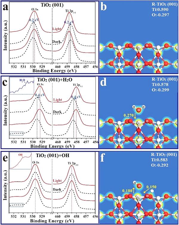 e) 光催化反应中纯R-TiO2(001)分解分子水的SI-XPS光谱;